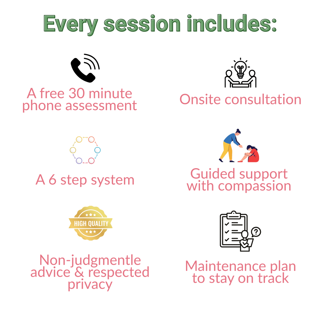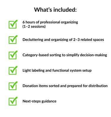 Ideal for: Seniors, first-time clients, or families needing help with one space. A focused session designed to deliver immediate relief and visible results.