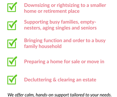 We provide professional organizing services in Calgary specializing in downsizing, supporting aging parents, seniors, baby boomers, families managing a busy household, and estate clearing. Our approach is respectful, private, patient, and judgment-free — designed to reduce overwhelm every step of the way and bring clarity during life transitions.